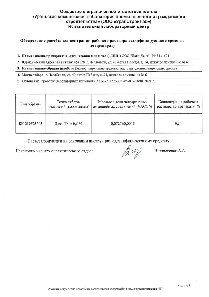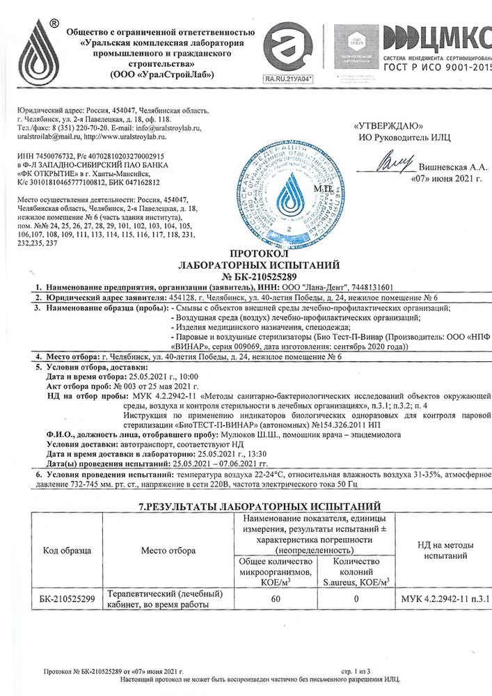 Стоматологическая клиника «Лана-Дент» сообщает своим пациентом, что в мае и июне 2021 г., в соответствии с программой производственного контроля, аккредитованным испытательным лабораторным центром ООО "УралСтройЛаб" производились исследования по соблюдению ООО «Лана-Дент» санитарных правил и выполнение санитарно-противоэпидемиологических (профилактических) мероприятий.